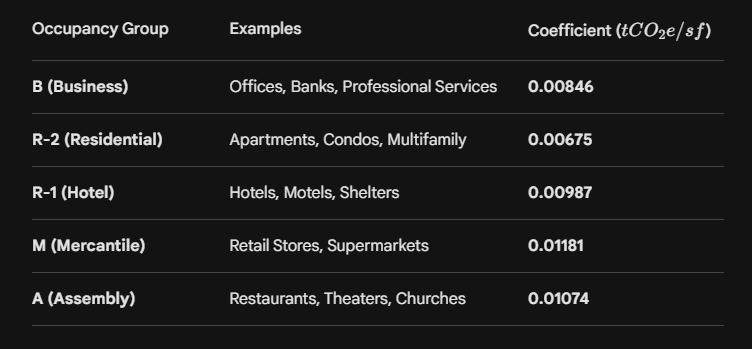 $$Allowed Limit (tCO_2e) = Building Area (sq. ft.) \times Occupancy Limit Coefficient$$
