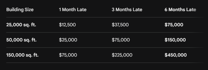 Formula: $Building Size \times \$0.50 \times Months Late = Total Fine$